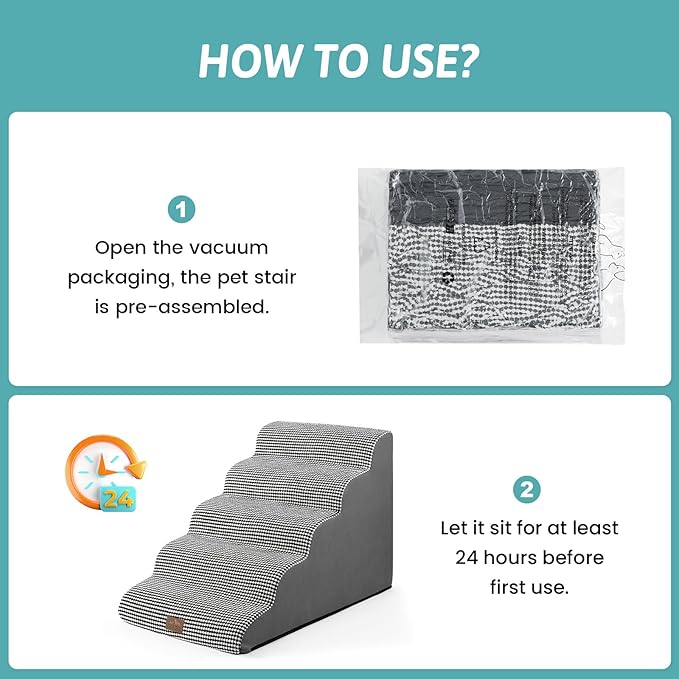 - EXTRA WIDE PET STAIRS: This wide dog ladder is designed to lean against the edge of a bed, car or other furniture. This is a portable dog ladder suitable for small, medium or large dogs. Please note that due to vacuum compression, it takes 24-48 hours for the sponge to rebound. There are wrinkles when opening the packaging, which is the result of long-term compression. You can iron it to keep it flat