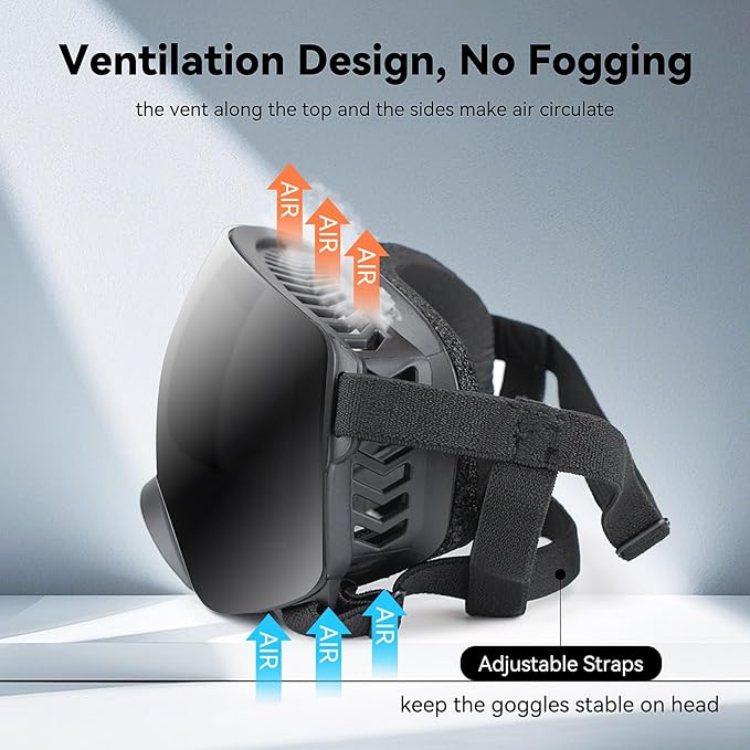 - Adjustable nylon strap allows you to adjust dog goggles according to the size of the dog without giving the dog a sense of restraint. Compared to other dog sunglasses, our products are designed with larger and more ventilation holes, it can better reduce the generation of steam and fog, offering further protect the safety of the dog