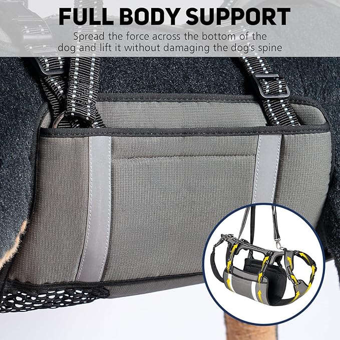 - 2. EFFORTLESS CAR & STAIR ACCESS + DUAL-HANDLE LIFTING Padded handles let two caregivers safely lift dogs into vehicles or over stairs. Durable straps adjust for small to large breeds.