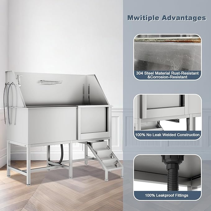 - IDEAL HEIGHT FOR WASHING & GROOMING:Our pet bathtub is designed at an ergonomic height to reduce bending and kneeling, making bathing and grooming easy, helping you say goodbye to the fatigue of the entire body. Stainless steel hot and cold water faucet elevated design suitable for large pet standing height, and 60" shower hose ensure thorough cleaning for different body types.