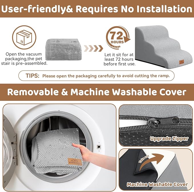 - No Assembly Required & Easy to Clean: When you open the packaging, the pet stair is already assembled. Before the first use, it should be left standing for at least 48-72 hours for the foam to fully expand. NOTE!! Open the packaging carefully to avoid cutting the stair! The outer cover can be removed for cleaning and supports machine washing or hand washing. Please note that the inner foam is not washable.