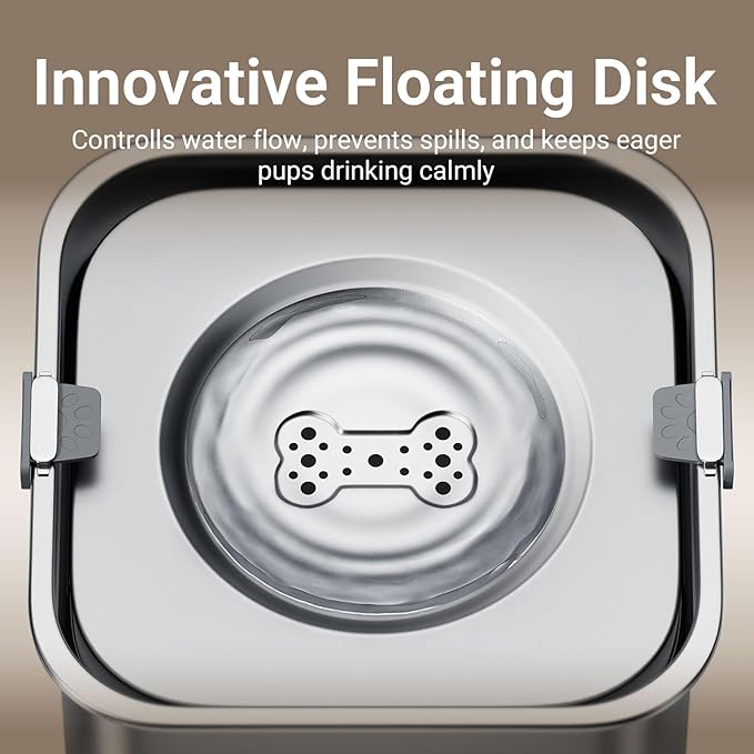 - One-Piece Floating Disk: One-piece floating disk doesn't need to be disassembled and cleaned to avoid harboring dirt. The stainless steel material of the floating disk can avoid pet chewing and prolong the service life of our spill proof dog water bowl