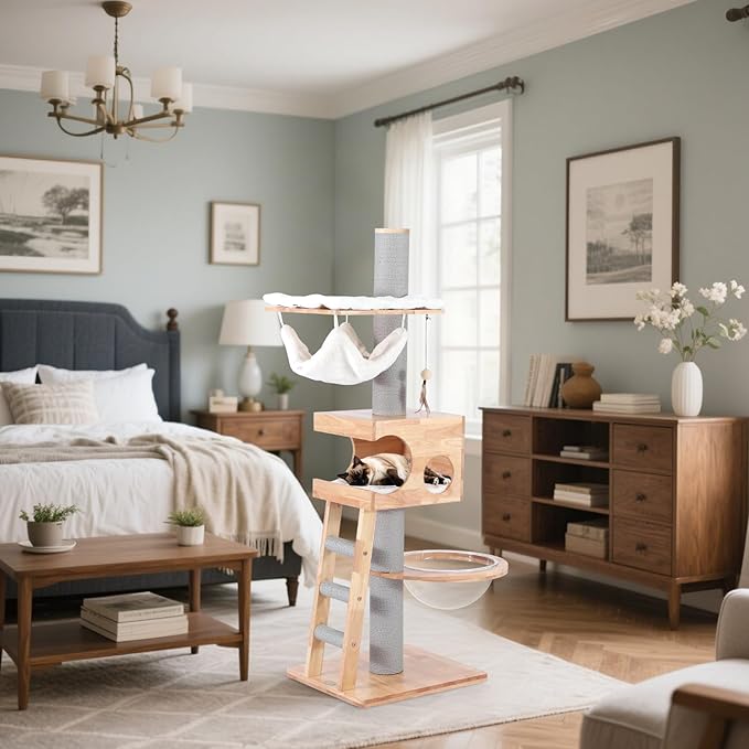 - 【Specialized for Cats' Needs】This cat tree has multiple levels for your kitty to do all the things she loves. With fully wrapped scratching posts, fluffy cat hammock, transparent bowl and climb labber, it is the ultimate spot for your cat to climb, scratch, and relax.
