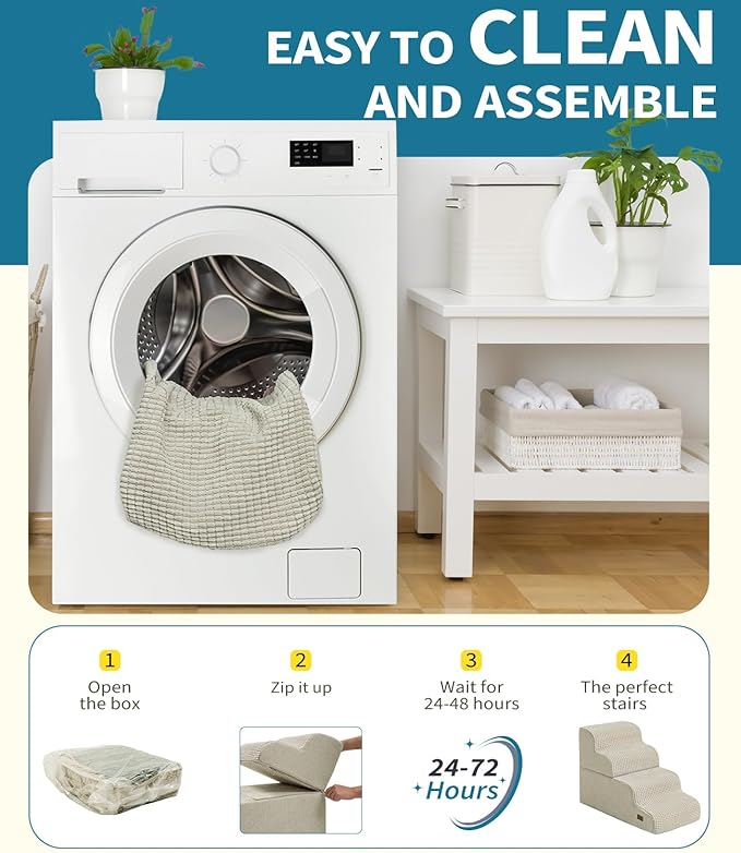 - Easy to Clean - The dog stairs feature a removable, machine washable cover for effortless cleaning. Using without assemble, our pet stairs provide a safe and convenient way for your furry friend to access higher surfaces without the risk of injury or strain on their joints.
