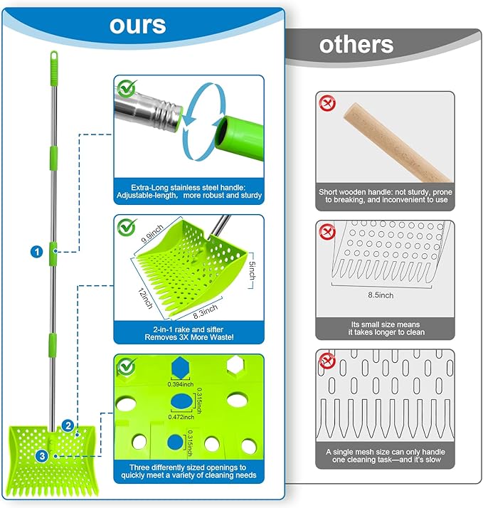 - 【The All-in-One Multi-Sifter Tool — Ideal for Coops, Beaches & Small Farms】: Don’t limit yourself to chicken coops! This versatile Litter Scooper is ideal for cleaning up after goats, rabbits, dogs, cats, pigs, ponies, and other small livestock. Plus, it doubles as a beach sand sifter to effortlessly separate shells from sand. One tool, endless uses — the only scooper you’ll ever need!