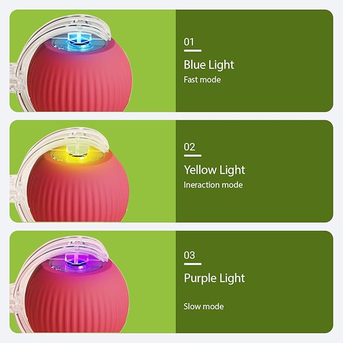 • Three Interaction Modes: Cat toys for indoor Cats has three modes, fast mode (Blue lights) rolls fast on high rug, slow mode (Purple lights) moves well on floor, Interactive mode (Yellow lights) only moves when nudged by your cats. Short press to switching working mode, and distinguish via the color of the light
