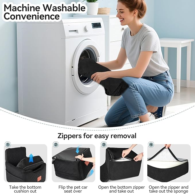 - Detachable and Washable:This pet car seat is very easy to clean,with its fully detachable design.The dog bed has a built-in sliding zipper, just remove all the foam, and then machine wash the seat covers.The bottom of the booster seat is waterproof, protection against accidents. Please note that the inner foam is not washable.