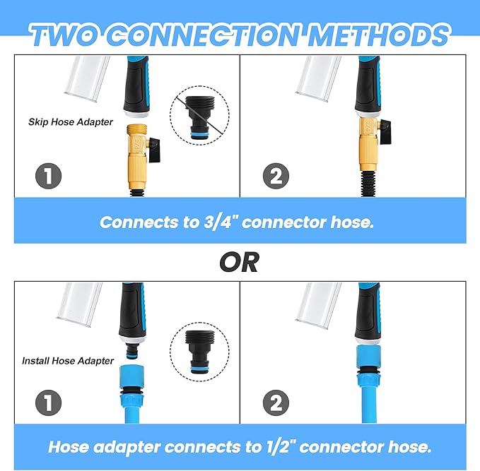 - 【Complete Cleaning Kits】This soap sprayer fits all standard American garden hoses with 3/4 inch garden hose thread (GHT). No adapter required, just connect and go! You can also use a quick connect to connect a 1/2 inch garden hose.