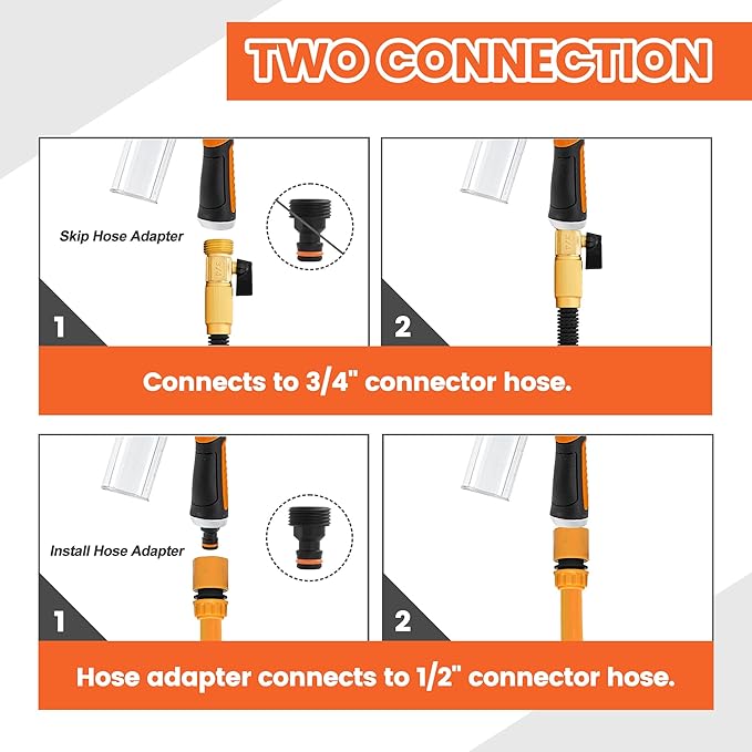 - 【Wide Application Hose Nozzle 】 The washing spray nozzle comes with quick connector ports and rubber gasckets, fits any standard garden shower water hose, you can easily connect it with your garden hose, The foam sprayer is made of high-grade plastic, this garden hose nozzle is easy to grip, slip-resistant and comfortable fit