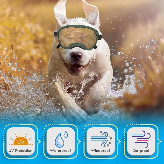 Dog Goggles for Large Dogs, UV Wind Dust Fog Protection, Soft Frame Adjustable Dog Sunglasses, Summer Driving & Winter Snow Eyewear, Tactical Pet Glasses with Elastic Strap (Green)