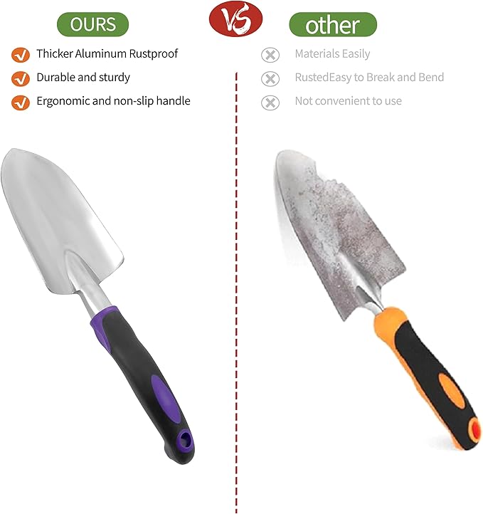 - 🌻DURABLE, HIGH-QUALITY HAND TOOLS – This set includes a hand trowel, transplanter, rake, fork, and weeder, all made from premium rust-resistant metal with ergonomic anti-slip handles to maximize comfort and durability.