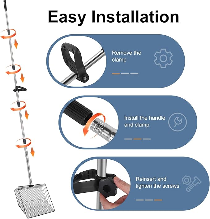 - 【Easy to Install and Clean】: This mul-tifunctional litter sifting shovel is easy to assemble, just align, clamp, and screw. The head and handle are connected by secure screws that ensure a stable and long-lasting connection. The simple swivel thread connection makes it easy to adjust and use. The non stick litter scooper design reduces feces from sticking to the scoop, simply rinse with water.