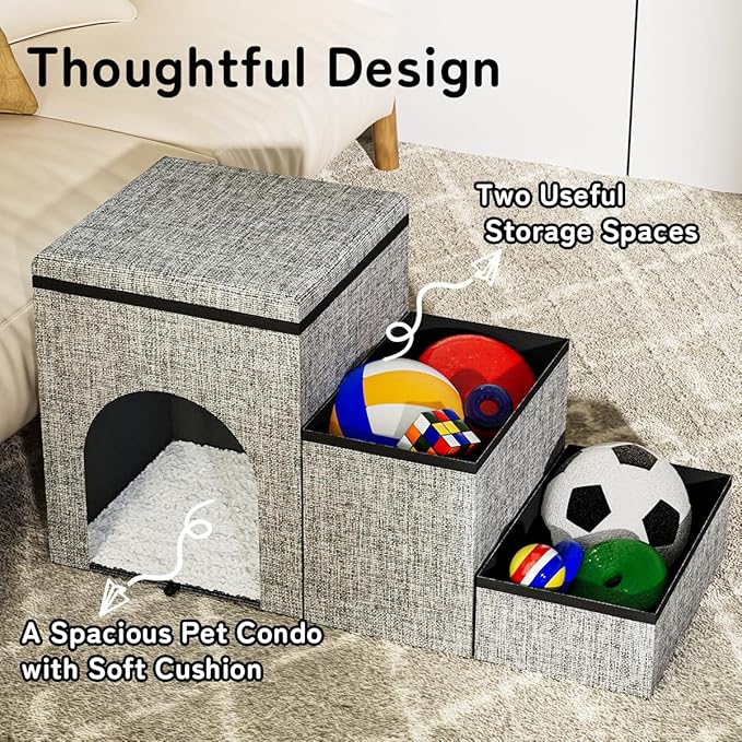 - Triple-Function Design → Stairs: Assist pets in climbing sofas/beds → Cozy Shelter: Spacious pet condo with soft plush cushion → Storage: Two hidden compartments for toys