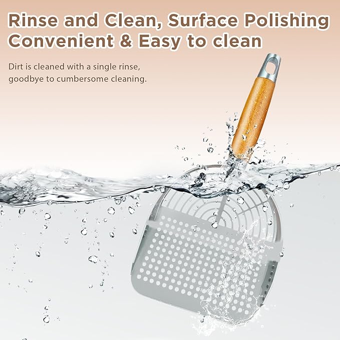 - Dual-Size Holes for All Litter Types โ This stainless steel cat litter scoop features 4mm micro-holes for fine litter and 6mm gaps for large clumps, doubling as both a litter sifter and litter shovel. Smooth edges and angled holes prevent litter from sticking, eliminating the need for a separate box scooper!