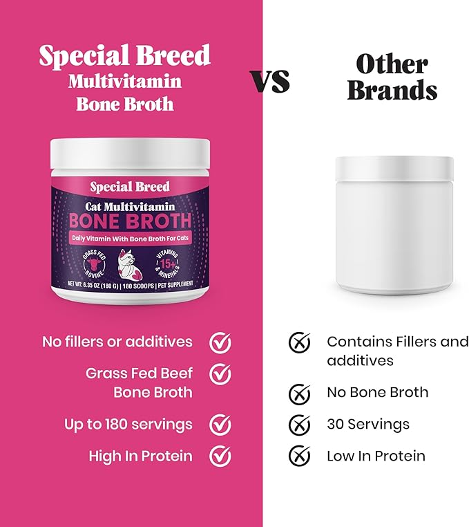 - Super Ingredients And No Inactive Fillers: Special Breed's Multivitamin with grass fed beef bone broth for cats is a tasty supplement packed full of essential vitamins, minerals, and nutrients. Created with no fillers or inactive ingredients, we dare you to compare our ingredients and servings to the other brands.