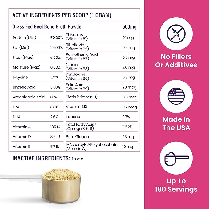 - Protein & Collagen Bone Broth: Grass fed beef bone broth provides extra nutrition for immune support, joint strength, and an extra heaping of protein and collagen.