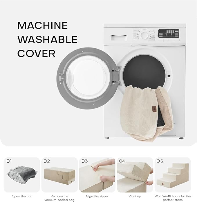 - 【Easy to Clean】: The dog stairs feature a removable, machine washable cover for effortless cleaning. Simply take out the foam core for washing; however, please avoid cleaning the foam and board. After removing from the compression bag, allow 24-48 hours for the foam to fully expand before use for optimal comfort