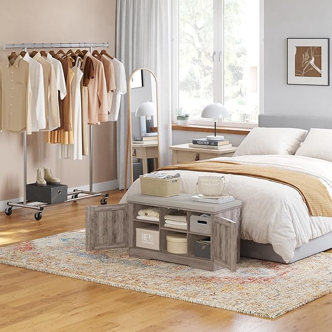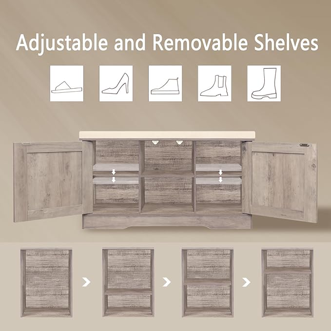 DINZI LVJ Shoe Bench, Entryway Storage Bench with Doors, Cushion, 2-Tier Shoe Rack with 6-Cubby, 31.5”L x 13.8”W Shoe Organizer Cabinet, Adjustable Shelf, Living Room, Bedroom, Greige