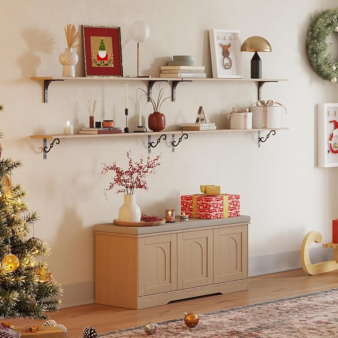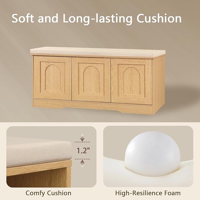 DINZI LVJ Shoe Bench, Entryway Storage Bench with Doors, Cushion, 2-Tier Shoe Rack with 6-Cubby, 39.4”L x 13.8”W Shoe Organizer Cabinet, Adjustable Shelf, Living Room, Bedroom, Natural