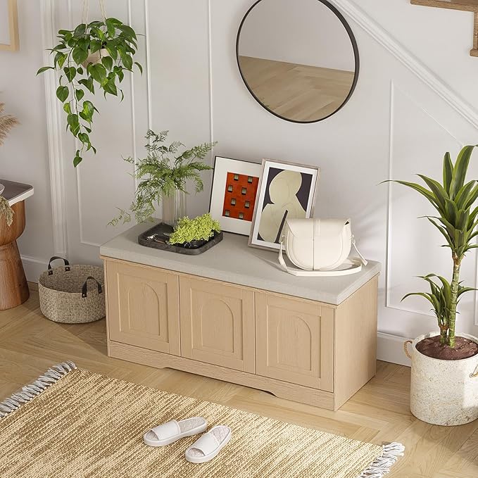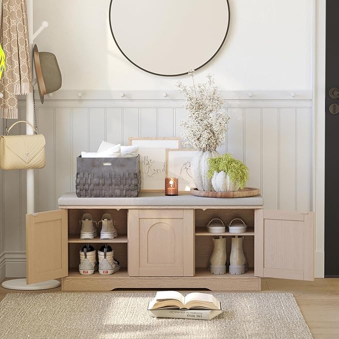 - 【Effortless Push-to-open Door】Feature a fully enclosed design with a press-to-open mechanism, keeping shoes clean and tidy while avoiding accidental bumps against door handles during use. Reasonable height and soft cushion let you change shoes by sitting on the bench more comfortable without bending down or squatting