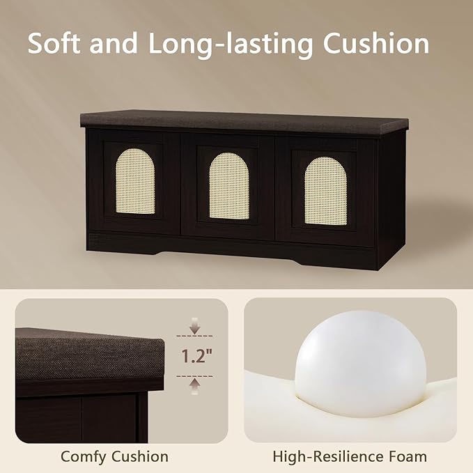 DINZI LVJ Shoe Bench, Entryway Storage Bench with Doors, Cushion, 2-Tier Shoe Rack with 6-Cubby, 39.4”L x 13.8”W Shoe Organizer Cabinet, Adjustable Shelf, Living Room, Bedroom, Espresso with Rattan