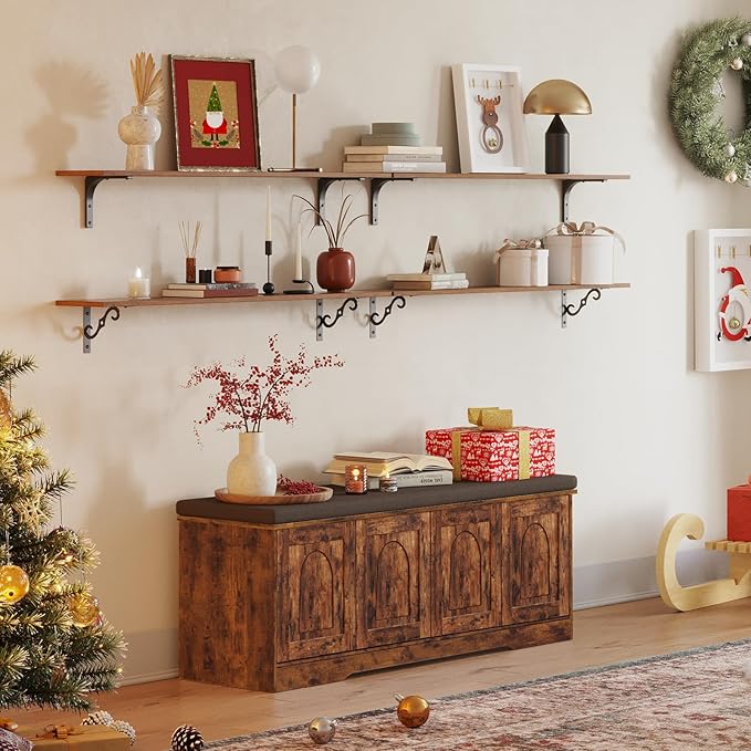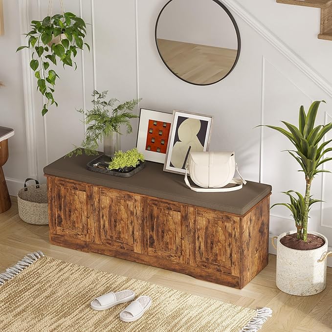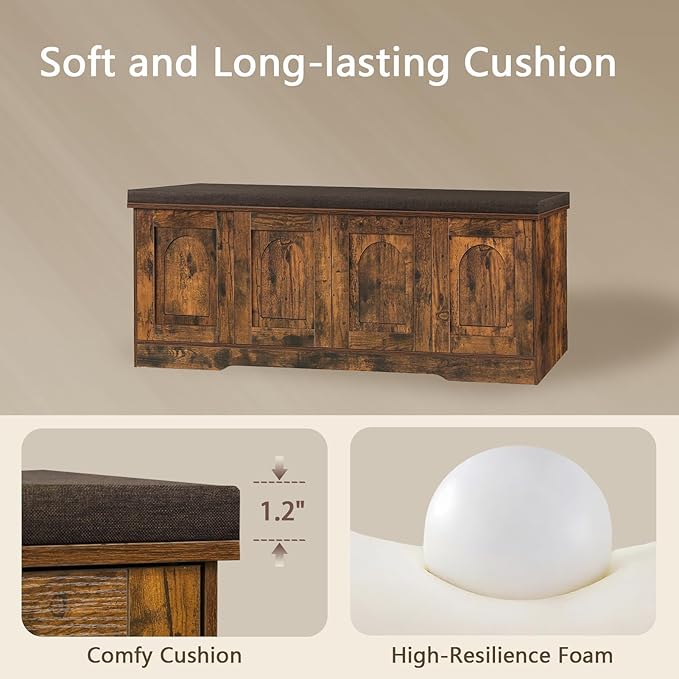 DINZI LVJ Shoe Bench, Entryway Storage Bench with Doors, Cushion, 2-Tier Shoe Rack with 8-Cubby, 47.2”L x 13.8”W Shoe Organizer Cabinet, Adjustable Shelf, Living Room, Bedroom, Rustic Brown