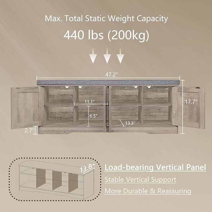 DINZI LVJ Shoe Bench, Entryway Storage Bench with Doors, Cushion, 2-Tier Shoe Rack with 8-Cubby, 47.2”L x 13.8”W Shoe Organizer Cabinet, Adjustable Shelf, Living Room, Bedroom, Gray Wash