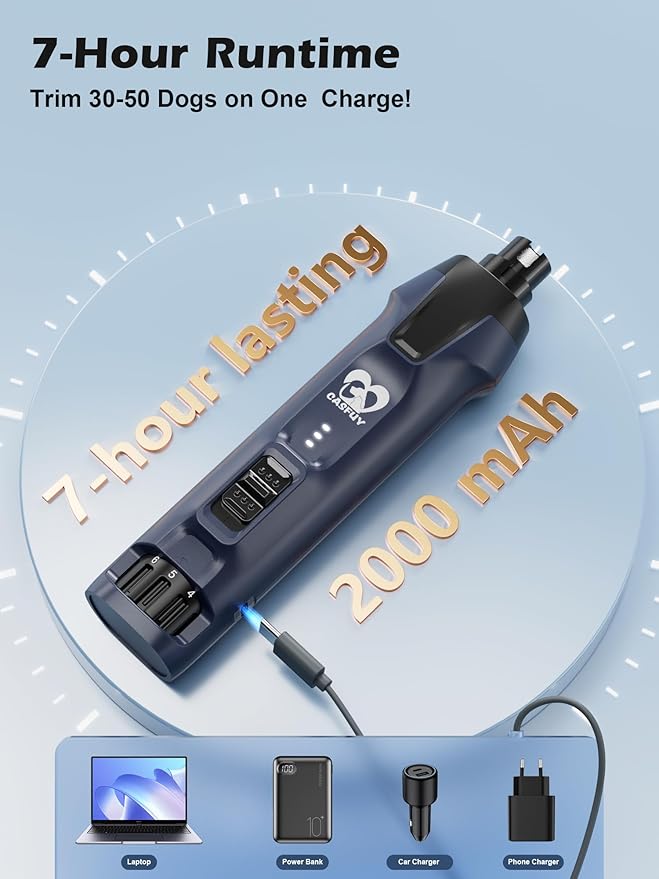 - 【7-Hour Runtime—Groom 30-50 Dogs】Powered by a 2000mAh lithium-ion battery, this nail drill for dogs delivers up to 7 hours of continuous use—even at max 12,000 RPM. That’s enough power to trim 30-50 dogs on a single charge! The universal Type-C charging (110V–220V) makes it perfect for home, salon, or travel use.