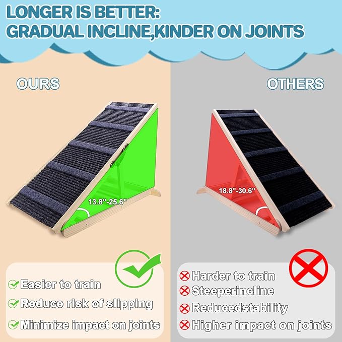 - 【Sturdy Durable Integrated Design】100% natural wood, excellent color, smooth and burr-free. Sturdy solid wood structure provides strong support. Unlike folding ramps, there are no cut parts, integrated design, higher load-bearing. The pet ramp has been independently safety tested and is rated to support pets weighing up to 200 pounds