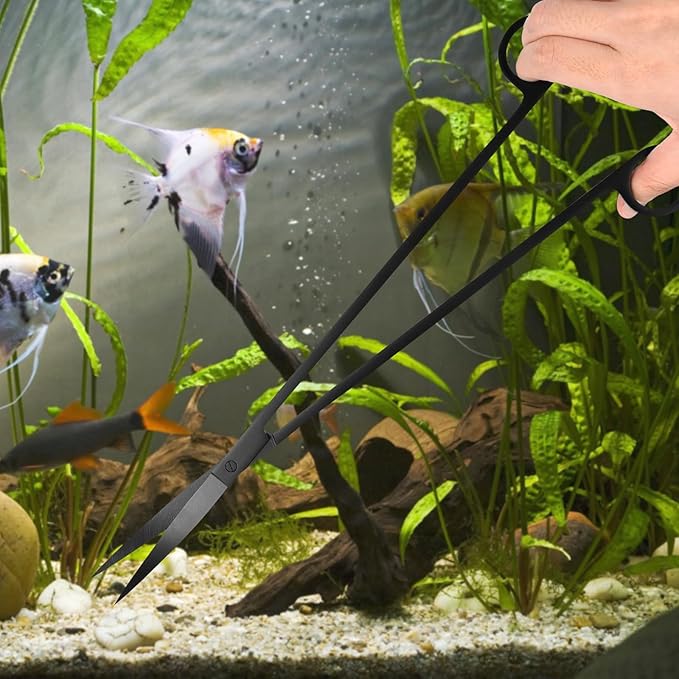 - 【Extra Long Design】This comprehensive aquarium aquascape tool kit includes 1 curved scissors (13.8in), 1 straight tweezers (15in), 1 curved tweezers (15in), and 1 sand spatula (15.3in). Perfect for regular maintenance tasks such as feeding, trimming, planting, and adding fish tank accessories with ease.