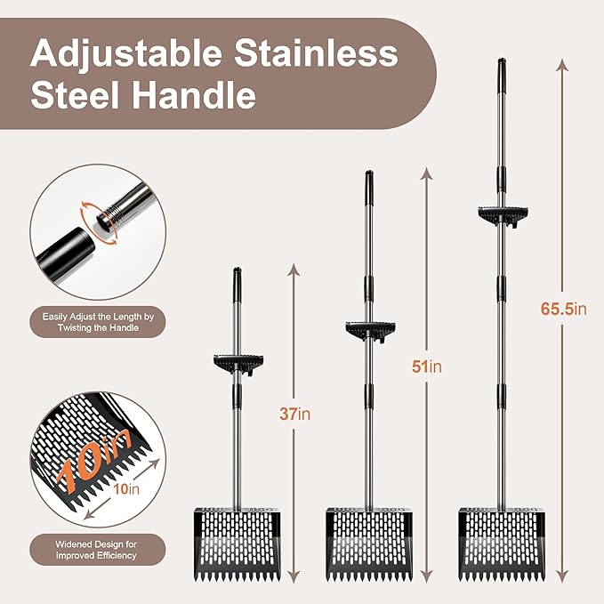 - ✅ Adjustable Stainless Steel Handle: The chicken poop scoop is equipped with a three-section stainless steel handle with a twist lock design that can be adjusted to 37 inches, 51 inches, and 65.5 inches to reduce strain on the back and knees. The ergonomic, non-slip rubber handle provides a more comfortable grip and better control