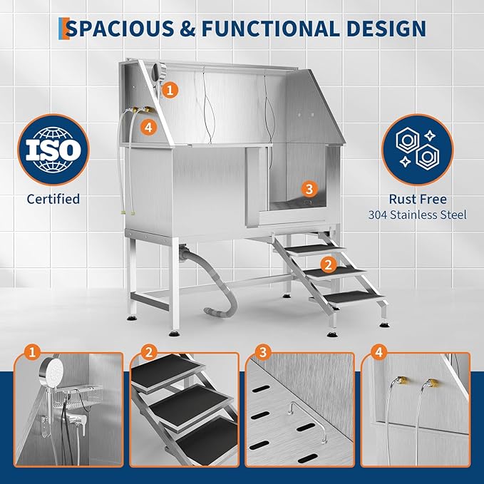 • Efficient Drainage System Removable floor grate prevents water accumulation and simplifies post-bath cleanup. Maintains tidy workspace during grooming sessions.