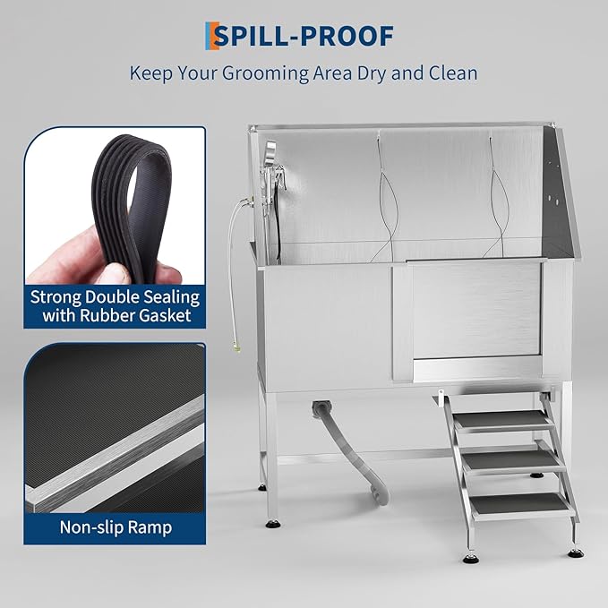 • Safety-Equipped Wash Tub Includes non-slip access ramp, storage cabinet, and locking gate mechanism to secure pets during bathing procedures.