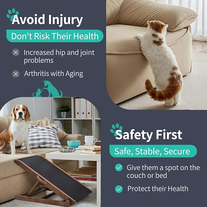 - STURDY & DURABLE: Our dog ramp for dogs and cats is specially made very well - solid wood construction and sturdy stainless steel fasteners, which has been tested to support up to 200lbs. When they jump off the bed, sofa, and sofa, there is no need to worry about getting injured, which provides safety for your pet.